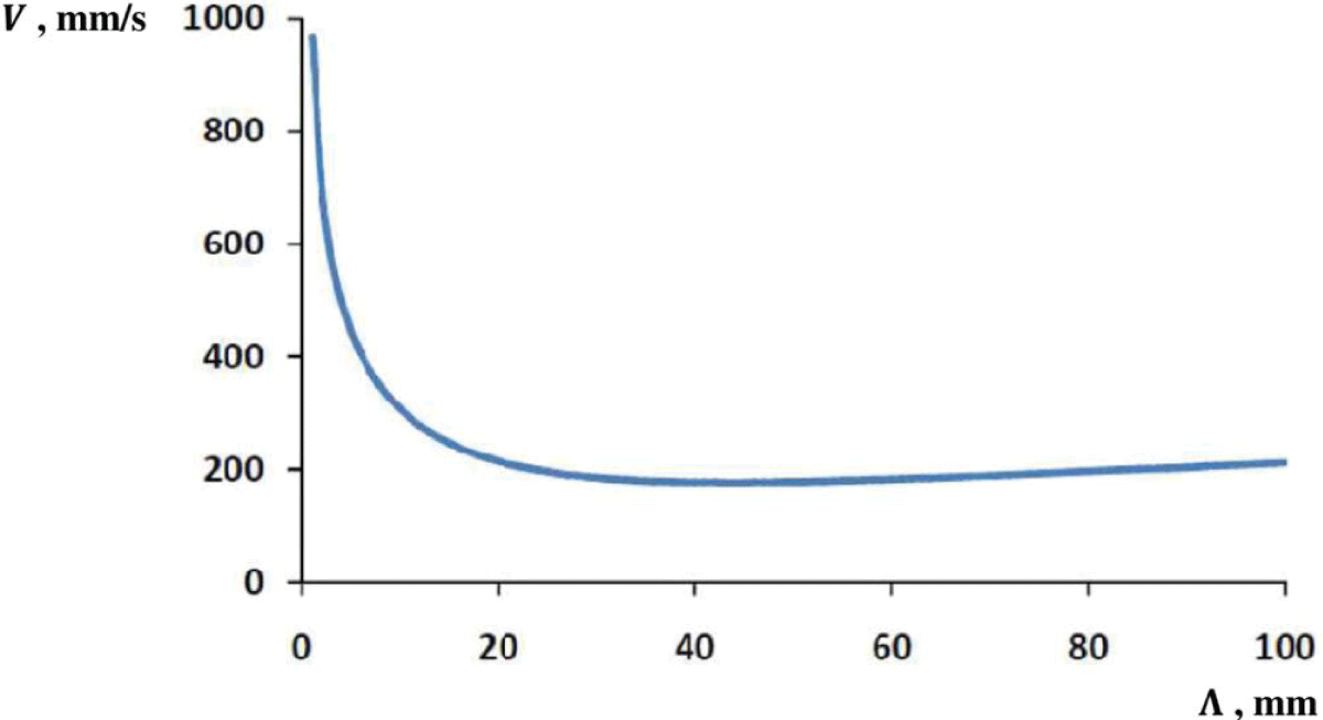 Figure 1 shows the V – Λ dependence calculated for the above-stated curve parameters σ, and g. The corresponding coordinates of the weakly expressed minimum, (10) and (11), are Λmin = 43.6 mm and Vmin = 163 mm/s, respectively.