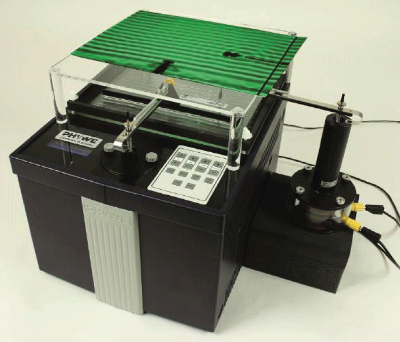 The ripple tank Complete 11260-88 produced by PHYWE Systeme GmbH & Co. KG, Gottingen, Germany (Figure 2) serves for the generation and experimental study of 5 – 60 Hz surface waves in water [17]. The integration in the ripple tank generator can cause a plug-shaped exciter to be dipped into the water for the generation of circular surface waves (see the Figure inserted for the scheme in the laboratory work report example).